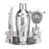 Descripción: SET SKOPJE (Set para preparación de bebidas con base. Incluye shaker, pinzas, sacacorchos, dosificador, colador y cuchillo.)