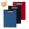 Carpeta de plástico con clip metálico. Incluye bloc de notas con 20 hojas. Incluye un compartimento plegable para sostener un bolígrafo. Cuenta con una pequeña solapa interna para colocar hojas adicionales o tarjetas de manera ordenada y accesible.