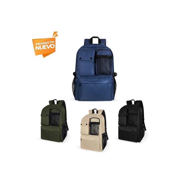Mochila con amplia bolsa principal con compartimento interno para laptop de hasta 15” y dos bolsas internas. Cuenta con 3 bolsillos frontales, dos de ellos con cierre y uno con sistema de botones. Tiene un par de ajustadores expandibles y laterales de malla.