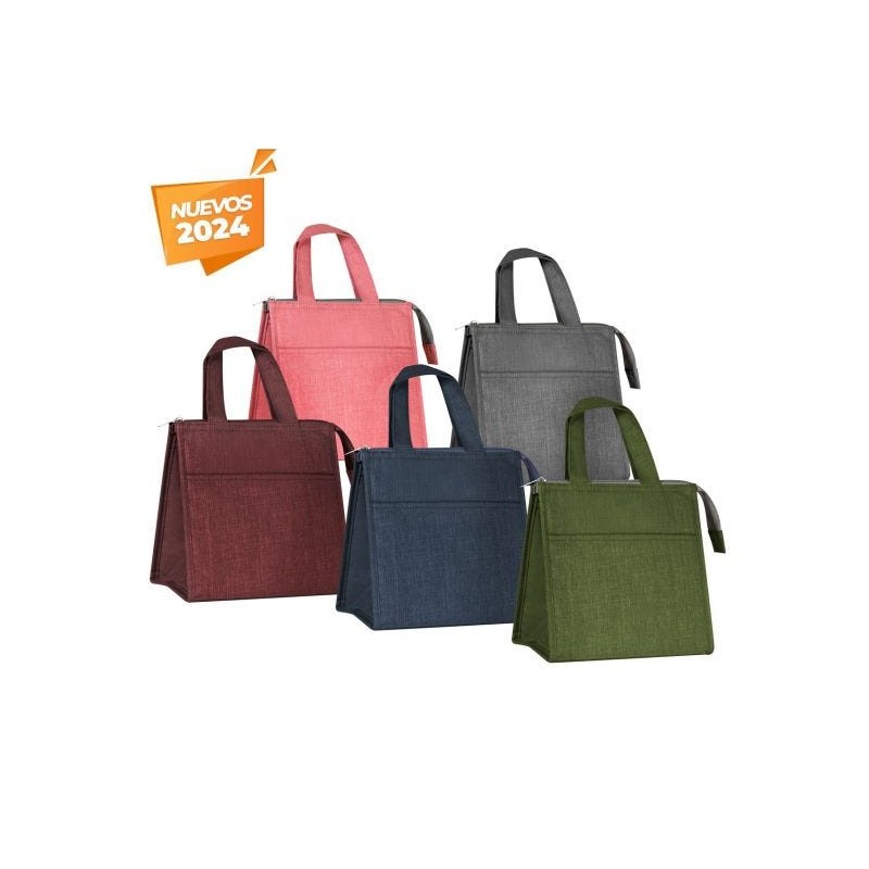 Lonchera de poliéster e interior metalizado, bolsillo frontal para organizar utensilios o pequeños accesorios. Bolsa principal con cierre y asa de mano que facilita su portabilidad.