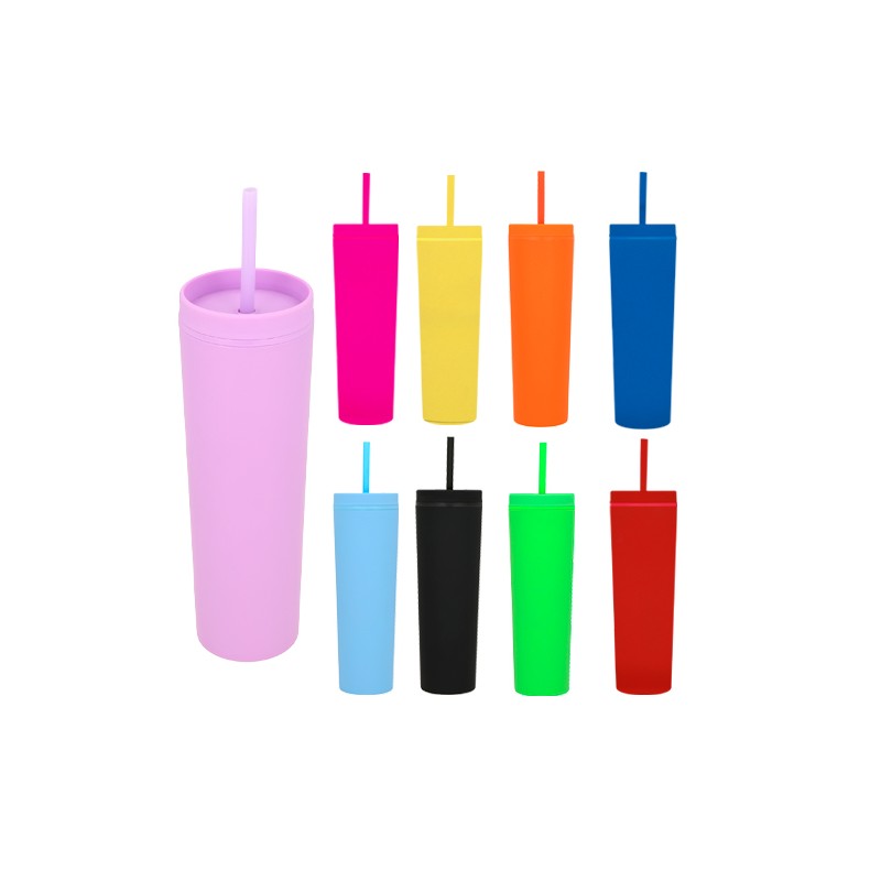 Termo de plástico con doble pared, tapa enroscable y acabado rubber. Incluye popote de plástico.